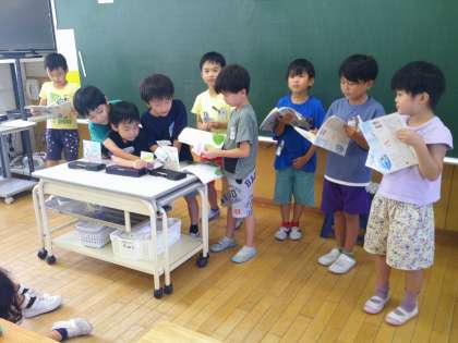 国語科で学習している「やくそく」のお話をグループ毎に音読しました。自分の役に合わせて、あおむしや木を動かしたり、友達と声を揃えたりしていました。