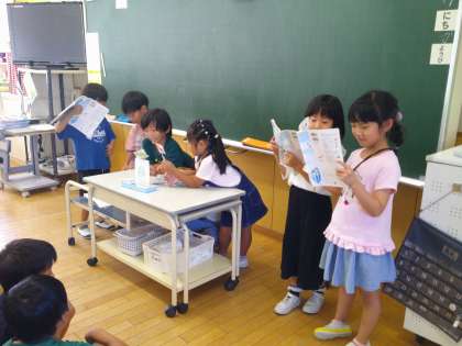 国語科で学習している「やくそく」のお話をグループ毎に音読しました。自分の役に合わせて、あおむしや木を動かしたり、友達と声を揃えたりしていました。