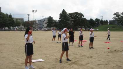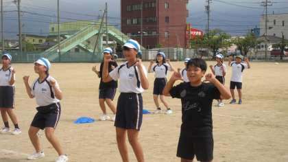 外での応援練習を行っています。声と隊列の大きさを確認しながら進めました。