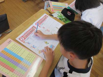 この日は、アルファベットの大文字と小文字の書き方を勉強しました。手本を見ながら丁寧に書きました。