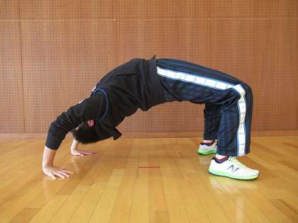 左の写真は、ブリッジです。写真のような体勢を5秒キープしてみましょう。