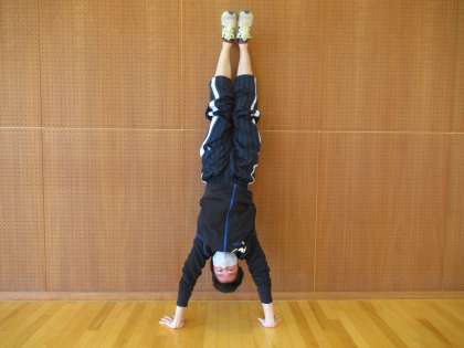 右の写真は、壁倒立です。写真のような体勢を5秒キープしてみましょう。