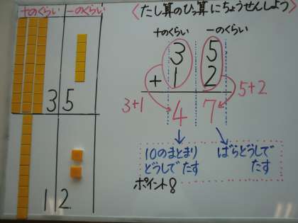 1年生のときにおべんきょうした「十のくらい」「一のくらい」がとても大せつです。ブロックをつかっておべんきょうすると、わかりやすいですよ。