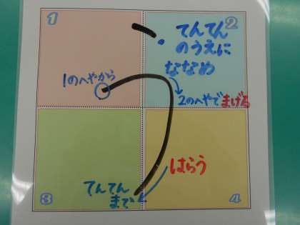4がつにべんきょうした「4つのへや」のどこをとおるのかを、しっかりたしかめながら、かいていきましょう。