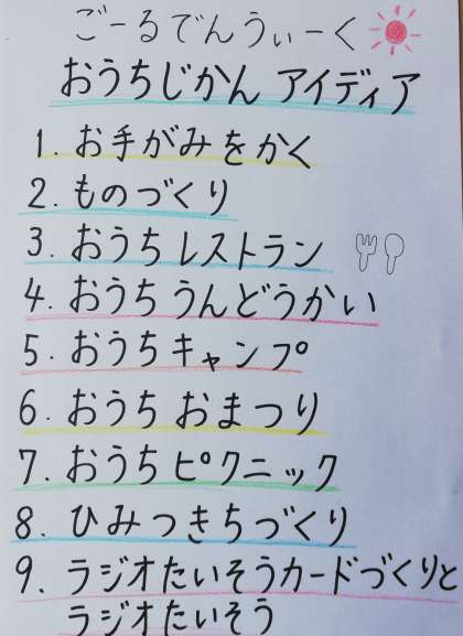 ゴールデンウィークがはじまりますね。おうちでたのしくすごす方法をかんがえてみたので、おうちの人とそうだんして、やってみたいなとおもったことにとりくんでみてくださいね。