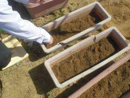 種植えのときには、指を1cm〜2cm土の中に入れます。