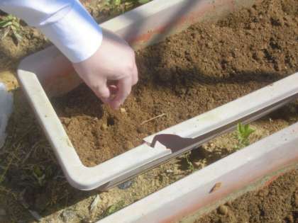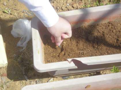 その後に、指であけたあなに種を入れて、まわりの土を乗せます。