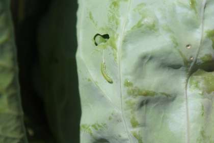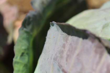 2まい目のしゃしんから、キャベツの葉の中にいるよう虫をよく見てみよう!