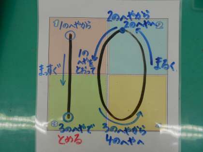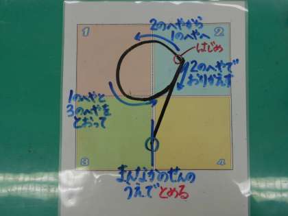 1ねんせいのみなさん、すうじのおけいこは、もう おわりましたか。すうじの「9」「10」を いっしょに たしかめていきましょう。「9」のたしかめポイントは、さいごのせんを、ななめにまっすぐかくことと まるをかくむきをたしかめることです。「10」のたしかめポイントは、1と0をおなじながさになるように かくことです。0は、うえから、かきはじめましょう。