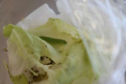 今日は、ラッキーなことにモンシロチョウがキャベツにたまごをうみつけるところを見ることができました。上手にキャベツのすきまに入り込むすがたに感動しました。新たに3ひきのよう虫やたまごが仲間入りしました。育てているよう虫たちも元気に大きくなっていますよ。