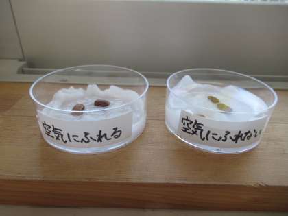 次の条件は、「発芽に空気が必要か」です。カップに、キットに入っている脱脂綿をしいて、インゲンマメを置きます。片方は、常に脱脂綿をしめらせておき、インゲンマメが空気にふれているようにします。もう片方は、水をたっぷり入れ、インゲンマメが空気にふれないようにします。この状態で、観察をしましょう。