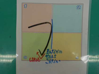 1ねんせいのみなさん、ひらがなおけいこは すすみましたか。ひらがな「か」のかきかたを いっしょに たしかめましょう。たしかめポイントは、1かくめのせんが、まんなかのてんてんを こえないことです。