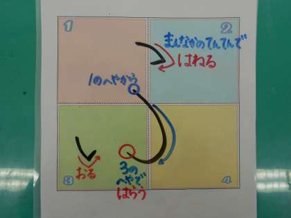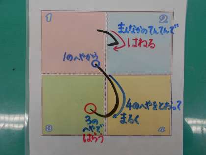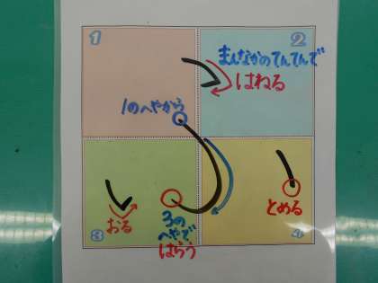 1ねんせいのみなさん、ひらがなおけいこは、すすんでいますか。ひらがなの「ふ」について、いっしょにたしかめていきましょう。「ふ」のたしかめポイントは、1かくめと2かくめが、まんなかのてんてんを とおることと てんのむきに きをつけることです。