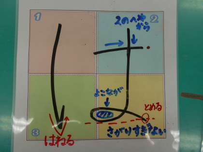 1ねんせいのみなさん、ひらがなおけいこは、すすんでいますか。ひらがなの「は」について、いっしょにたしかめていきましょう。「は」のたしかめポイントは、3かくめのむすびが、よこながのまるになるように かくことです。