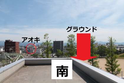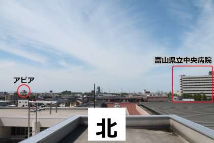 学校の北には、富山県立中央病院やアピアなど、大きな建物が見えます。また南にはグラウンドやアオキなど学校や家庭でよく使う施設がありますね。