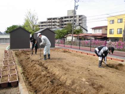 たくさんの先生が手つだってくださったおかげで、学年のはたけを作ることができました!みなさんが学校にきたら、サツマイモのなえやトウモロコシのたねをうえてもらいます。たのしみにしていてくださいね!