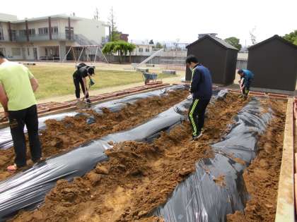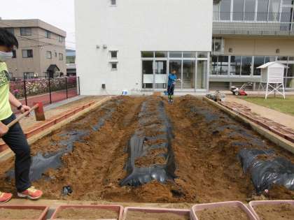 まず、スコップで土をもり上げて野さいをつくるぶぶん(うね)を作りました。そのあと、土のかんそうやざっそうがはえるのをふせぐために、うねのひょうめんにくろいろのビニールにかぶせました(マルチング)。