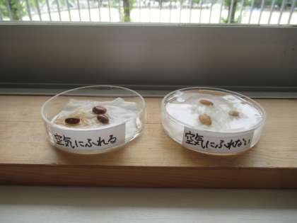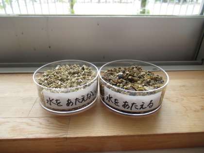 先生たちが植えたインゲンマメの様子です。今のところ、どの条件のインゲンマメも変化がありません。みんなももう植えたかな?