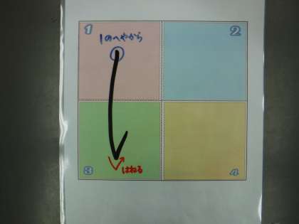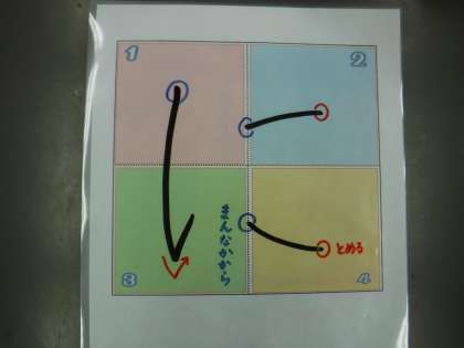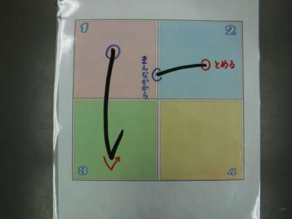 1ねんせいのみなさん、ひらがなおけいこは、すすんでいますか。ひらがな「に」をいっしょに たしかめていきましょう。たしかめポイントは、2かくめと3かくめのはじまりを まんなかのてんてんに あわせることです。