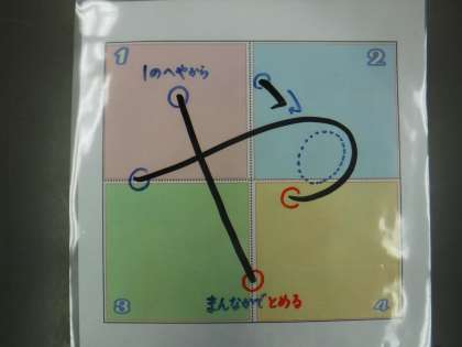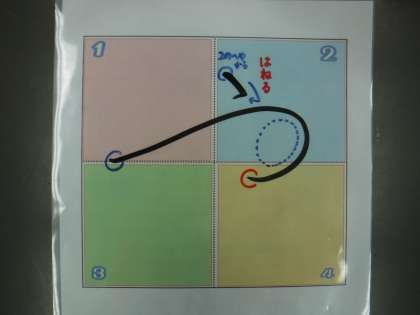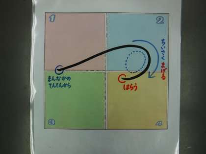 1ねんせいのみなさん、ひらがなおけいこは、すすんでいますか。ひらがな「や」をいっしょに たしかめていきましょう。たしかめポイントは、3かくめを まんなかのてんてんでとめることです。