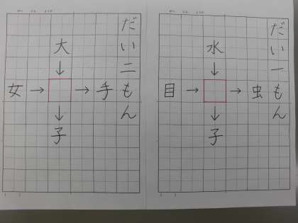 また、虫に食べられてしまったので、赤色のしかくに入るかん字が分からなくなってしまいました… みなさんでまん中に入るかん字を見つけましょう!
