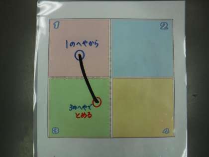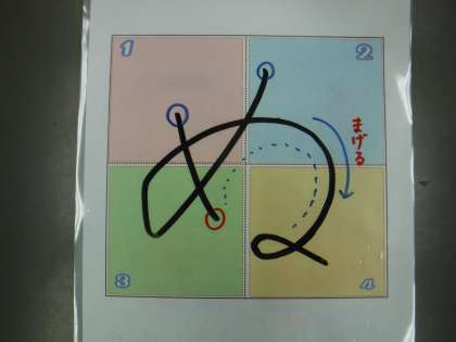 1ねんせいのみなさん、ひらがなおけいこは すすんでいますか。ひらがな「ぬ」のかきかたを いっしょに たしかめましょう。たしかめポイントは、2かくめは まるくなるようにまげて、4のへやで むすぶことです。