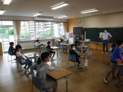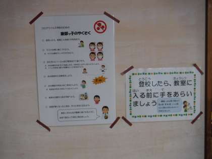 分散登校ということで全校児童とはいきませんでしたが、久しぶりに子供たちの元気な顔を見ることができ、ホッとしました。いろいろ不便なこと、心配なことがあるとは思いますが、感染予防を心がけながらも、できる範囲内で楽しく学校生活が送れるようにしていきたいと思います。学校では、次のことに特に気を付けて声をかけています。