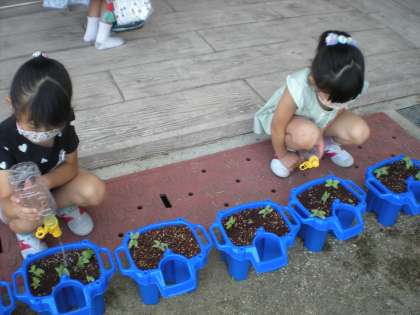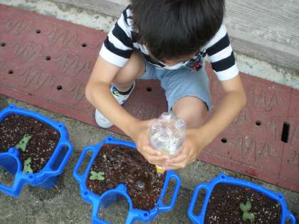 子供たちは、毎朝、学校に来るとアサガオの水やりをしています。「芽が、今日は、3つ出ていたよ」「1日で芽が、増えたよ」「もう少しで植えた種がみんな芽を出すよ」わくわくしながらアサガオを見に行き、水をたっぷりやっています。
