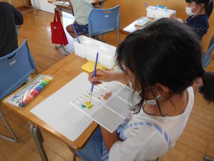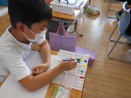 図工の学習で、絵の具の混ぜ方や、色の薄め方、筆の使い方等を用いて、様々な線や色をつくる学習をしました。子供たちは「赤と黄色を混ぜるとオレンジになった!」「もう少し水で薄めてみようかな」と線や色を工夫してつくっていました。