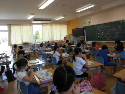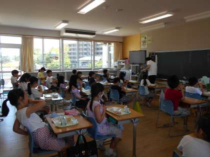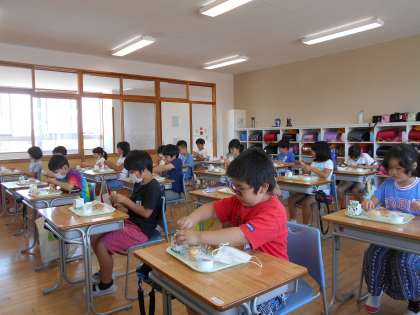 今日から簡易給食が始まりました。今日の献立はロールパン、蒸しパン、魚肉ソーセージ、ヨーグルト、牛乳でした。配膳の際も距離をとったり、手洗いを念入りにしたりと、子供たちは慎重に給食準備を行っていました。それでも子供たちの顔はにこにこで、給食を楽しみにしている様子が伝わってきました。