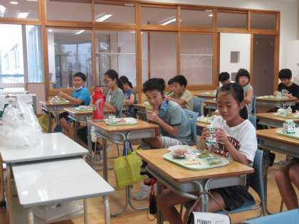 昨日から始まっている簡易給食ですが、子供たちは毎日給食の時間を楽しみに過ごしています。今日の献立は、黒糖コッペパン、チーズかまぼこ、ほうれんそうドーナツ、ぶどうゼリー、牛乳でした。感染症対策として、前向きで会話をせずに食べています。