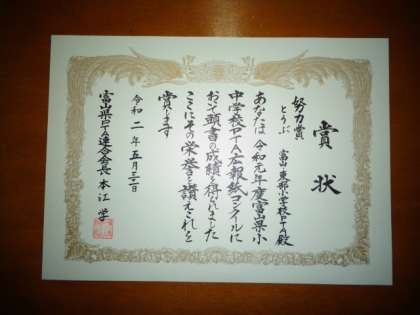 この度、令和元年度富山県小中学校PTA広報誌コンクールにおいて、本校PTA作成の広報誌“とうぶ”が「努力賞」を受賞されました。