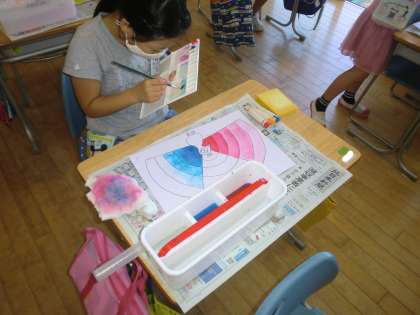 今日は、赤・青・黄の三色を使い、水の量を変え、くじゃくの羽を表現しました。「水や絵の具の量を変えるだけで、こんなにたくさんの色ができるんだね」と、友達の作品を見て感動していました。