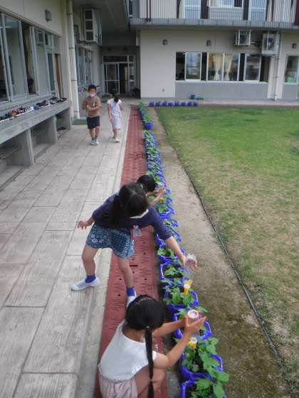 朝、1年生教室の外には、せっせと水やりをする1年生の姿が見られます。近くを通ると、「先生、先生」と言って自分の朝顔のところまで案内してくれます。そして、「見て見て」と自慢げにお話をしてくれます。どんな色の花が咲くか楽しみですね。