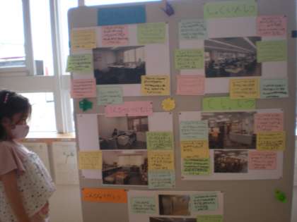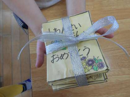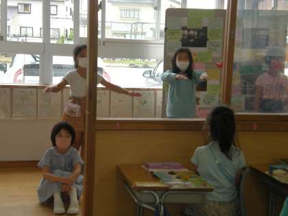 2年生さんが、学校紹介カードを持って来てくれました。大きい4枚のパネルに、いろいろな場所の写真と説明が、分かりやすく書いてありました。1年生は、休み時間等に興味津々で眺めていました。「理科室に骸骨があるらしい。探検に行って来よう」と、早速、調べに行く姿も、見られました。アサガオの種のプレゼントも、うれしそうに受け取っていました。
