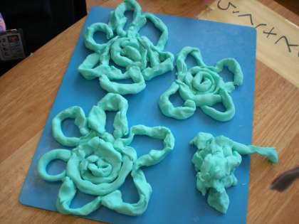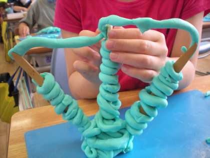 図画工作の時間に、長くした粘土のひもを重ねたり立てたりつないだりして、遊びました。つくりながら想像が広がり、楽しい作品が、次々に出来上がりました。