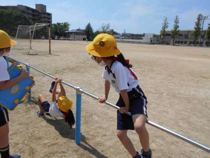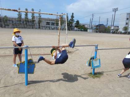 今、体育の学習で子供たちはミニハードルと鉄棒に取り組んでいます。鉄棒では、「懸垂振り」や「地球回り」等、いろいろな技に挑戦しました。友達に教えてもらう子や、隣同士で一緒に技を行う子もいて、それぞれ目標を決めて頑張っていました。
