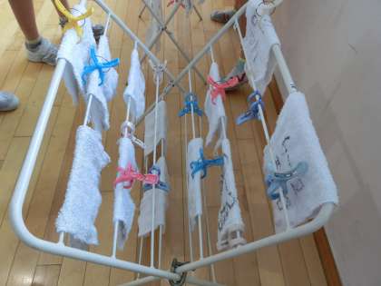 もみ洗いやつまみ洗いで丁寧に洗ったぞうきんは白くピカピカになり、「また手洗いしたい!」と楽しそうな子供達でした。