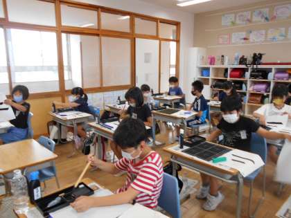 今、子供たちは書写の時間に漢字の「二」に取り組んでいます。練習書きを卒業して、半紙に書くようになりました。穂先の向きや右上がりに気を付けて筆を進めました。