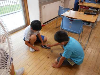 今、子供たちは国語で「こまを楽しむ」を学習しています。文章の中で様々なこまが登場するので、子供たちは家にあるこまを持ってきて、休み時間に回してみたり、こまに自分で作った模様を乗せて、オリジナル色変わりごまを作ってみたりと、楽しそうにこまに親しんでいます。