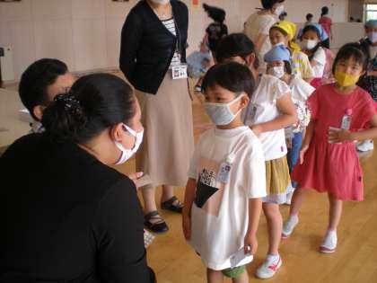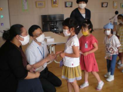 昼休みに、プレイルームでALTのルエラ先生との触れ合いタイムがありました。外国語活動で覚えた言葉を使ってお話ししようと、たくさんの子供たちが、張り切って参加しました。「hello」と挨拶したり、自分の気分を「good」と答えたりして、どきどきの会話を楽しみました。