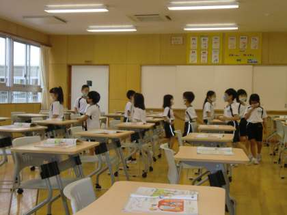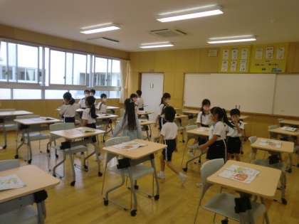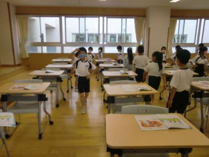 今日は、2拍子や3拍子の曲を行進したり、踊ったりしながら聴きました。行進曲では、先頭で指揮をする人に続いて、2拍子を感じながら元気よく行進しました。二つのグループに分け、行進している姿を見ると「行進がそろっていてきれい!」「1,2と声に出して、一緒に行進したくなるね」と口々に話していました。