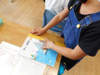 算数の学習では、竹のものさしを使っています。初めて見る長さの単位をたくさん練習して、すらすら書けるようになりました。調べるものにものさしをまっすぐ合わせたり、細かい目盛りを読んだりすることを頑張っています。