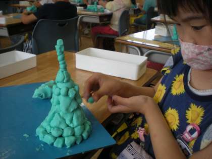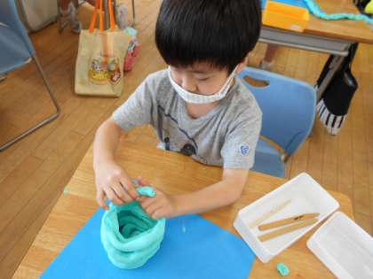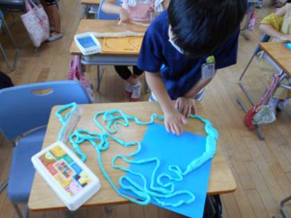 粘土での学習も、3回目。長いひもをつくったり、いろいろな形をつくったりするのも上手になってきました。ボール、三角おむすび、サイコロの形を組み合わせタワーや生き物をつくったり、長いひもをいろいろなところに渡したり、互いの発想を楽しみながら夢中になって取り組みました。