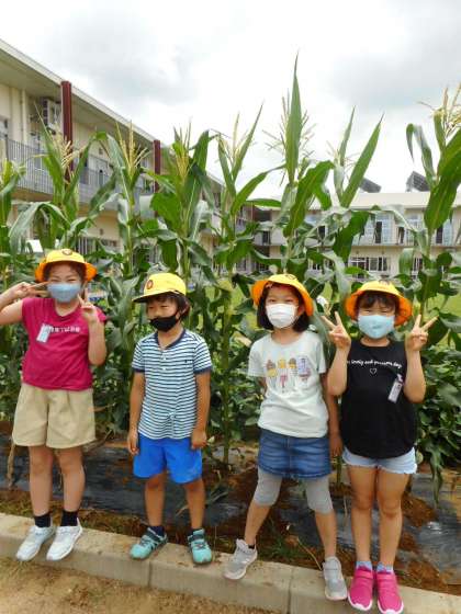 久しぶりにみんなでトウモロコシのお世話をしました。前にみんなでお世話をしたときは、背が同じくらいでしたが、もうすっかりみんなの身長をこえ、トウモロコシの赤ちゃんができてきました。