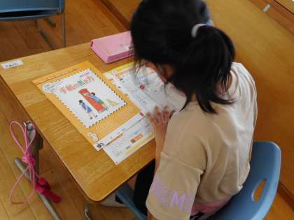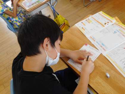 手紙の宛名や郵便番号を書く学習をしました。何度も住所を確認しながら、間違えないようにと真剣に書いていました。はがきの裏には、「風鈴を描こうかな」など夏らしいものを思い浮かべながら、楽しそうに絵を描いていました。どんな手紙が完成するのか楽しみです。