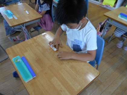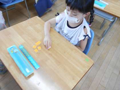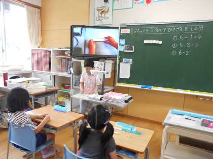 算数科で、引き算の勉強をしています。ブロックを動かして、引き算の問題にチャレンジしているところです。子供たちは、繰り返しの練習で、すらすら計算できるようになってきています。