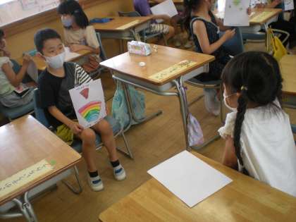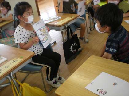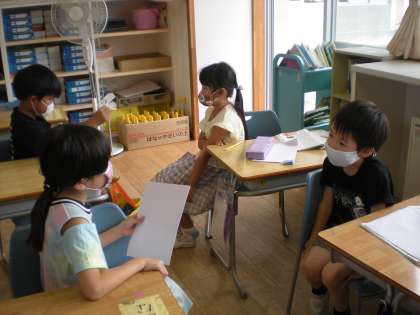 国語科の学習で、好きな食べ物を絵を見せながら伝え合いました。好きなわけも付け加えながら、うれしそうに話していました。聞く子供も興味津々で、友達の好きなものについて、「どんなふうに食べますか」「何味が、好きですか」等、次々といろいろな質問が飛び交っていました。