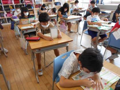 梅雨も明けて、夏らしい暑い日が続いています。夏休みに向けて学習もまとめに入っていますが、今日ははがきの宛名の書き方について学習しました。子供たちは住所や宛名の書く位置に気を付けて丁寧な字で書いています。