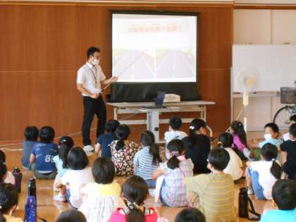 今日、学校で自転車安全教室を開催しました。既に「自転車に乗れるよ!」と話してくれる子供もいますが、改めて交通ルールや自転車のブレーキのかけ方などを一緒に学習しました。子供たちは「知ってる!合っててよかった」「え、そうなの!知らなかった」と短い時間の中でも興味津々に取り組んでいました。